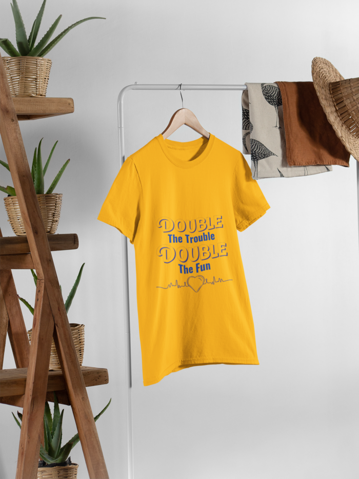 Playful & Bold Design: Showcases the cheeky phrase “Double the Trouble, Double the Fun” with a heart and heartbeat line graphic—perfect for those who embrace chaos with joy!