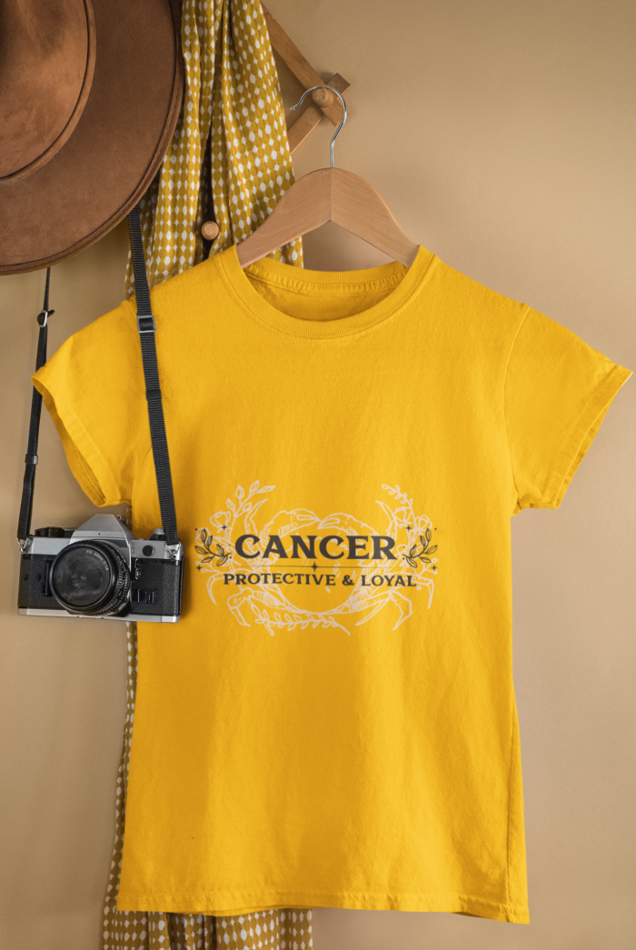 Zodiac-Inspired Design: Showcases the Cancer sign with an elegant crab illustration and “Protective & Loyal” motto, highlighting the sign’s nurturing nature.